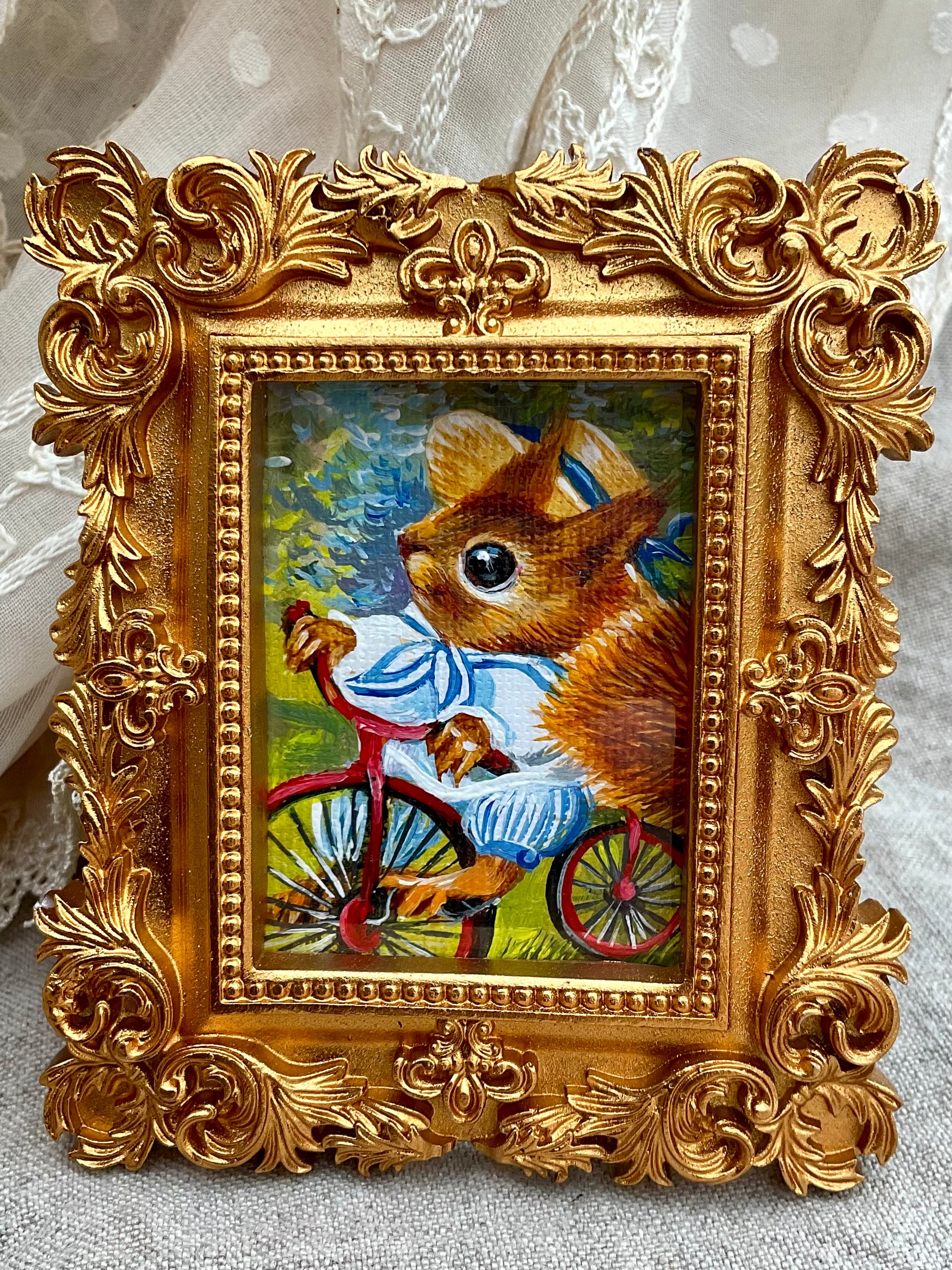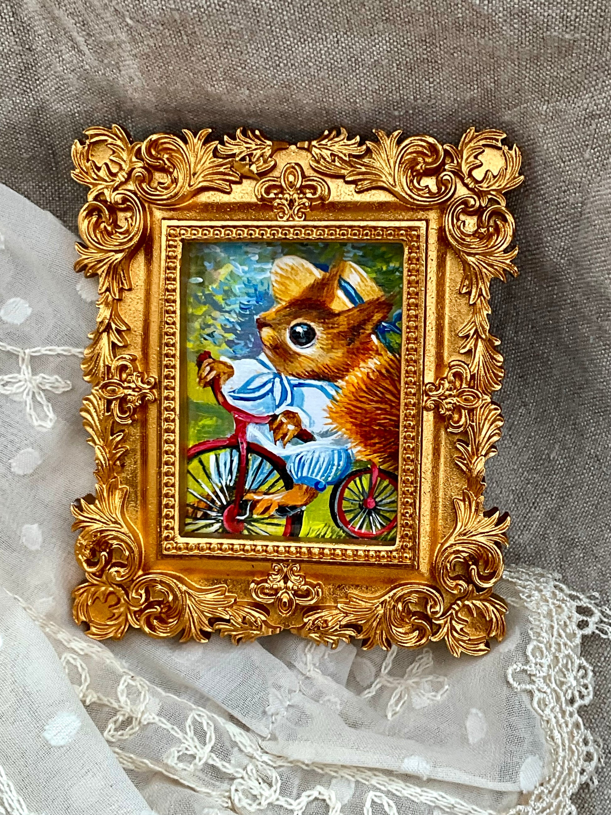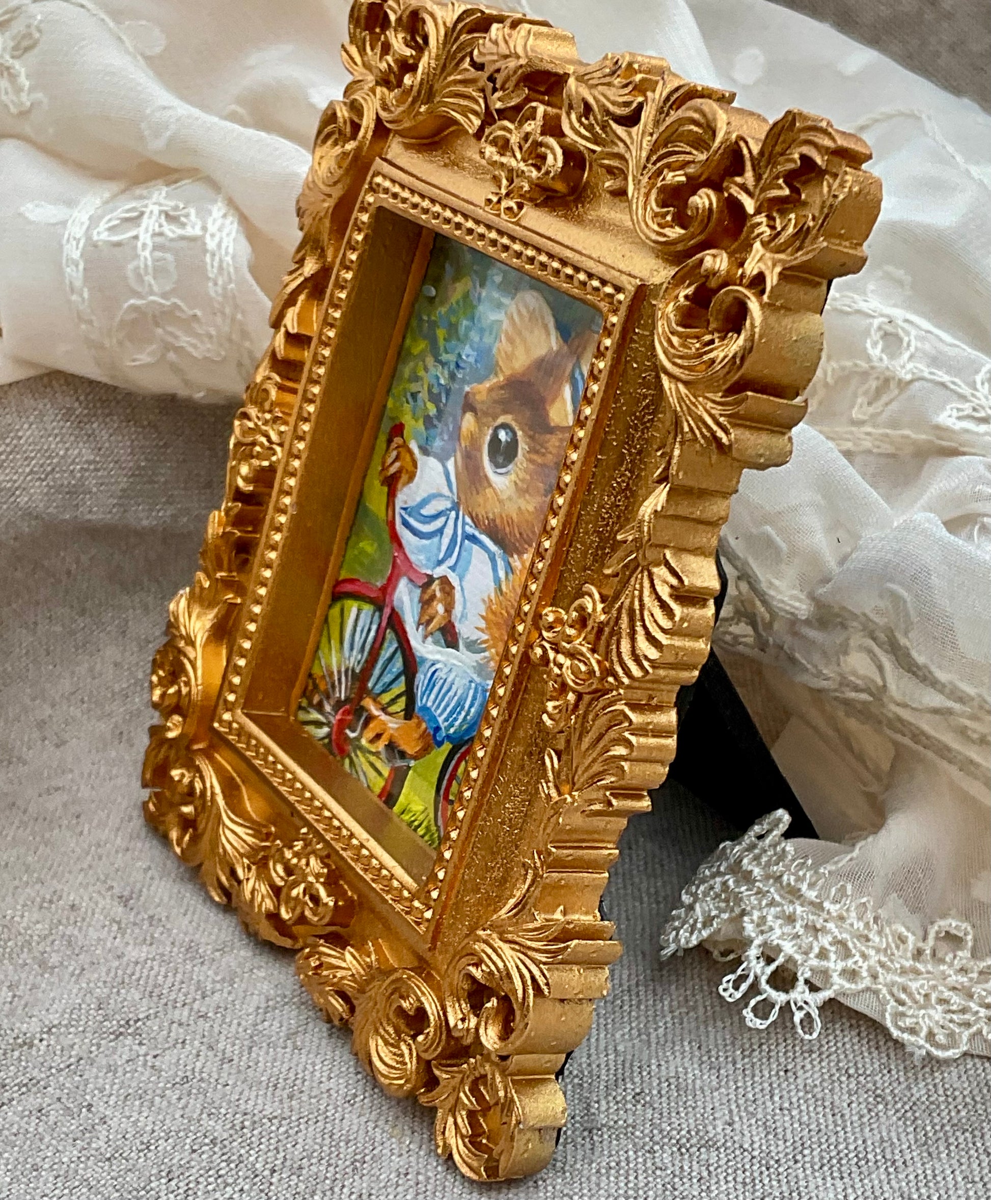 Acrylic on canvas impressionistic miniature, framed in golden baroque frame, hanging or standing options, 8x9.5 cm.