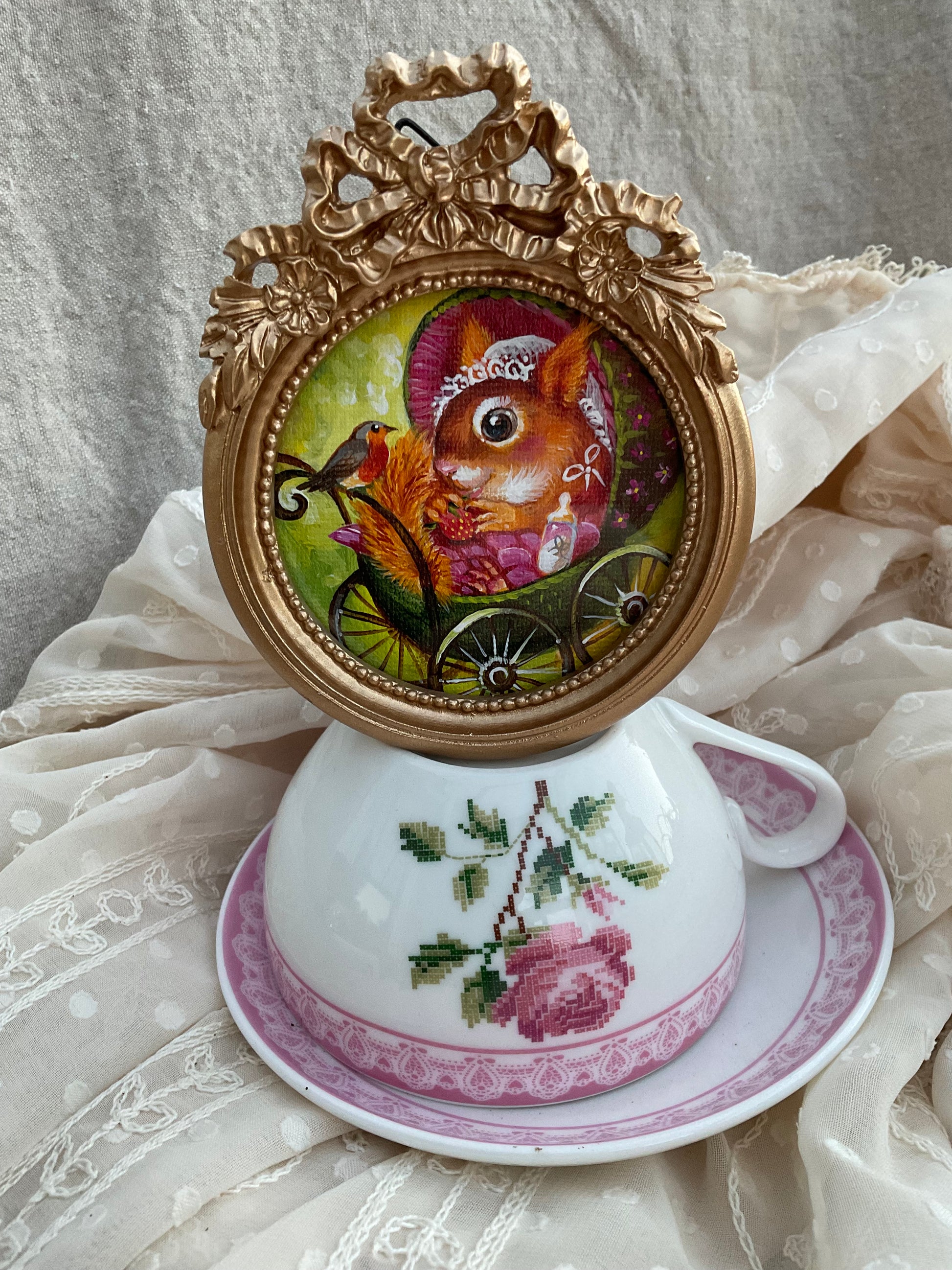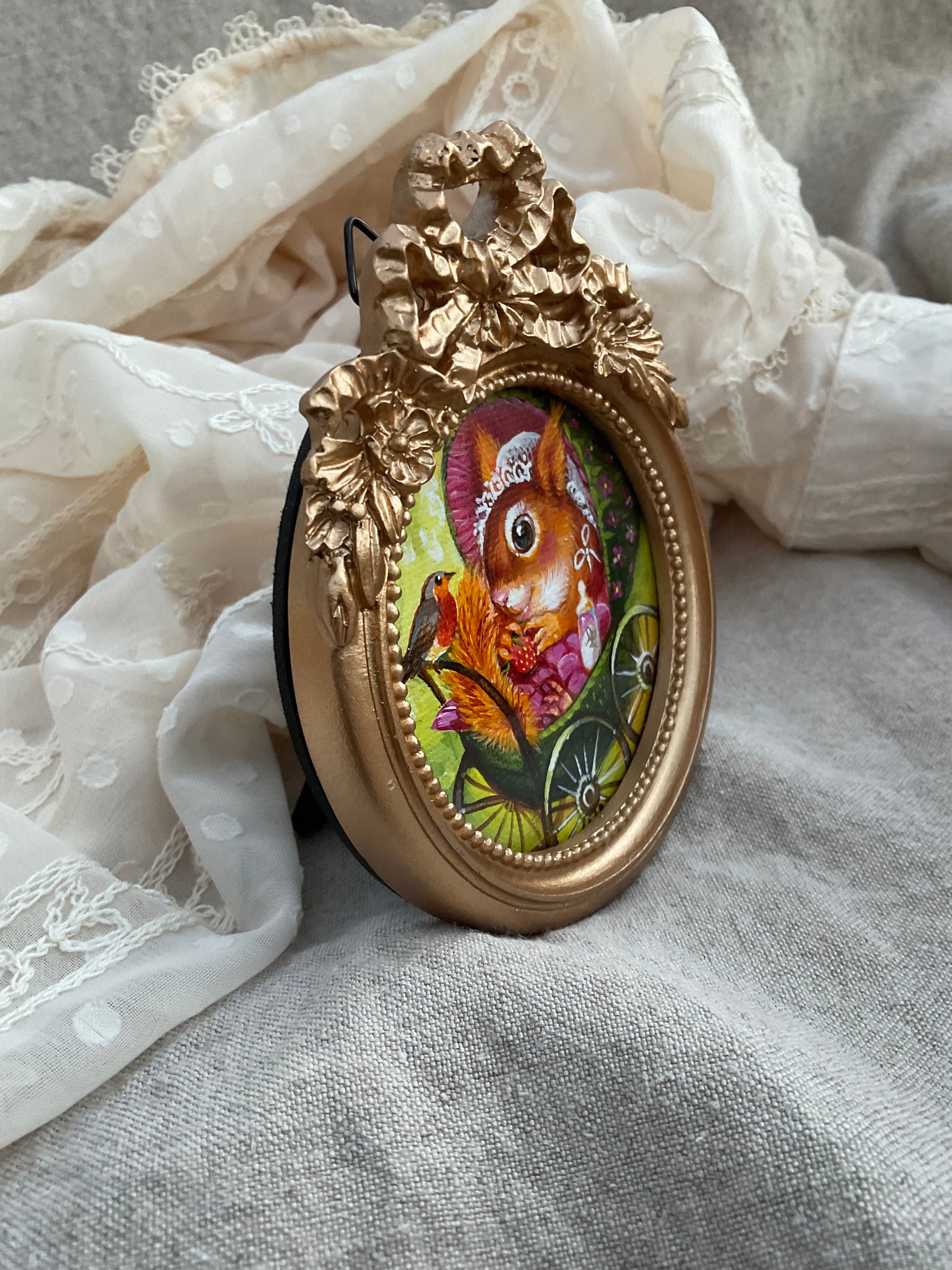 Original miniature, acrylic in canvas, framed in golden baroque frame, can be standing or hanging. Canvas 7 cm in diameter, frame 11x9 cm.